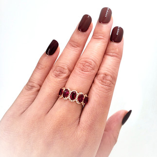 經典時尚的紅寶石光環款式,配合黃金色的典雅藤蔓造型設計;可配搭小巧精緻的單鑽耳環及頸鏈營造平易近人的親和感,以減低黃金色復古設計的強勢氣質。