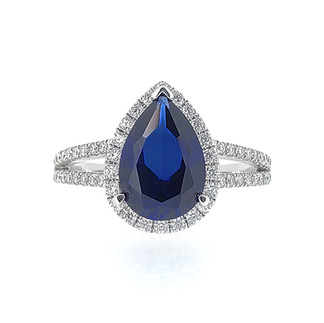 水滴形皇家深藍寶石能帶出知性婉約的一面;配上光環及雙戒臂設計則能令手指顯得更修長高貴。配襯輕盈的線形垂吊耳環更能顯出女性的知性美。
